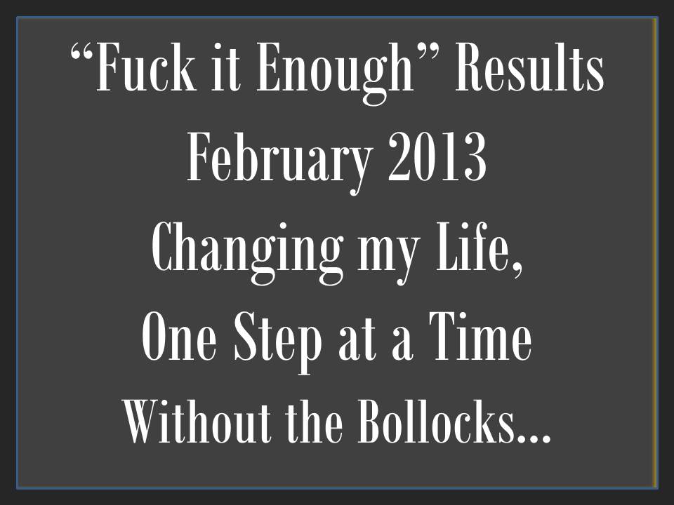 So “Fuck it, Enough” February had a lot of slip-ups, but seriously, tackling the sleep/tiredness thoughts is one of my great achievements so far. It’s a HUGE bad habit to break, and by focusing on it for a month, I think I’ve cracked it. No more dread when looking at the alarm clock for me…